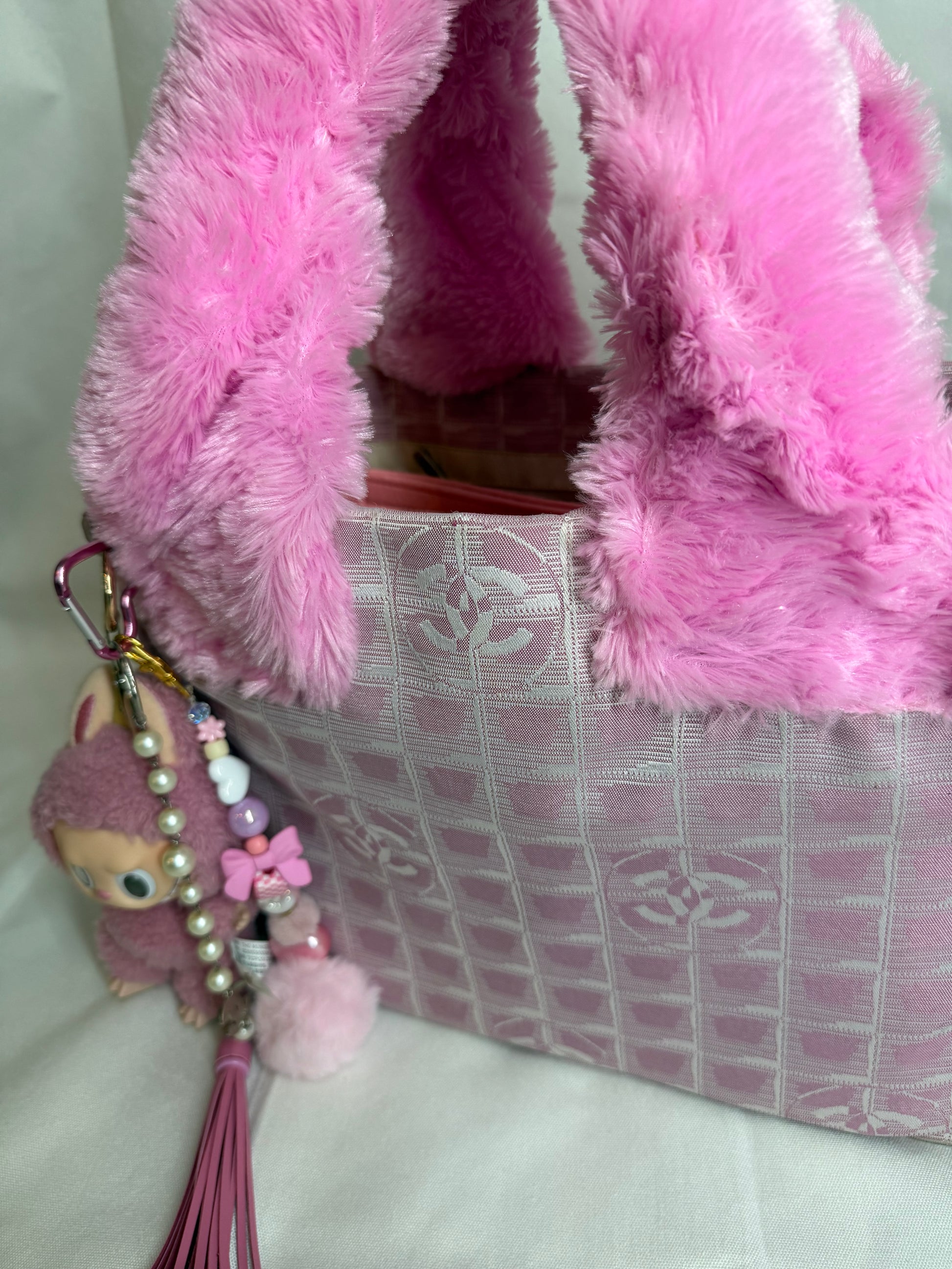 This is an authentic Chanel designer handbag. Cleaned, reshaped, and new fuzzy handles! LABUBU included!